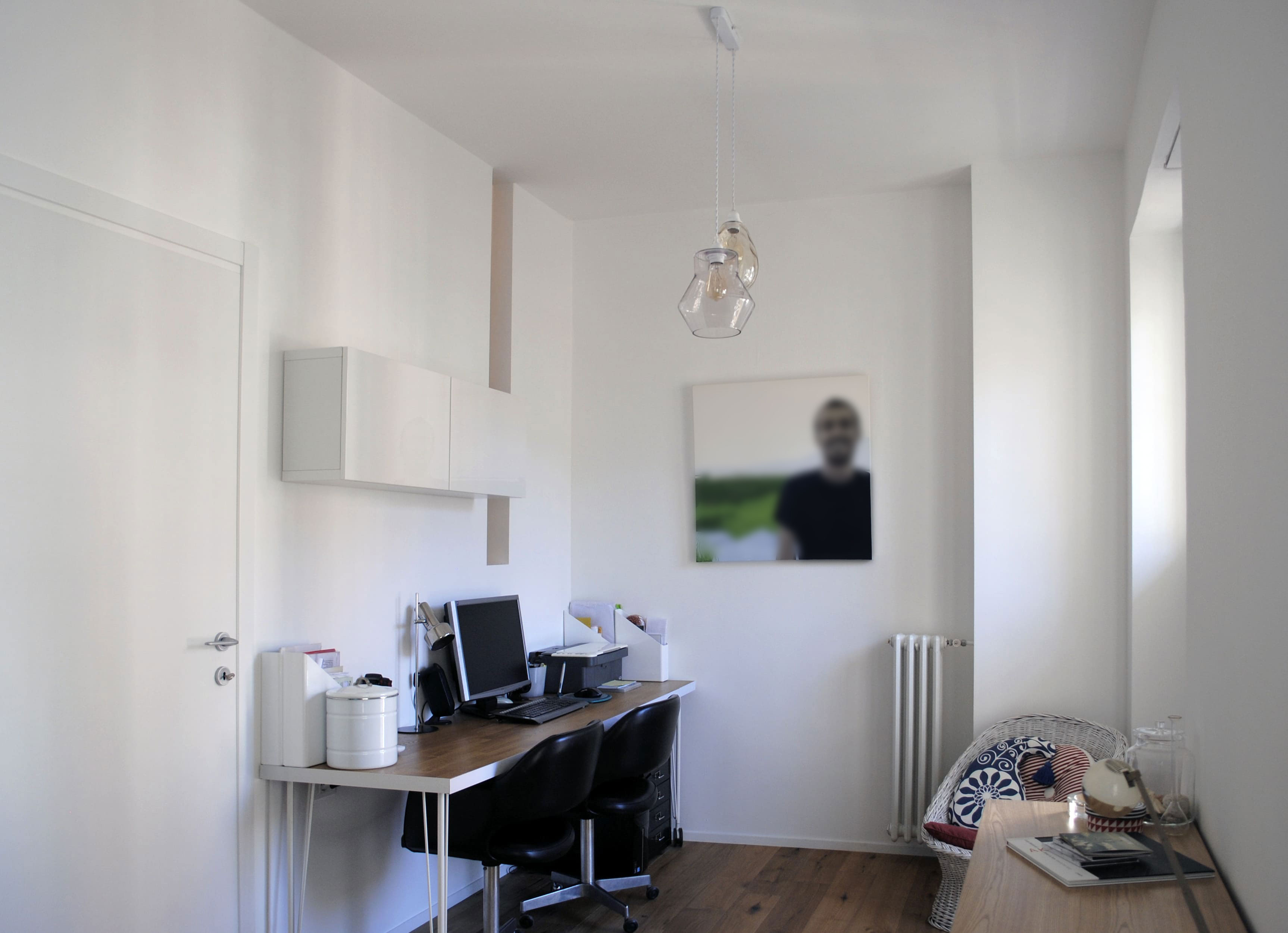 Lo stato di fatto dell'appartamento aveva molti mq mal sfruttati. Il delizioso terrazzo dava sulla camera da letto mentre la zona giorno affacciava sul cortile interno, ampi spazi disimpegnati erano senza funzione e non utilizzati, il bagno di limitate dimensioni era mal disposto. Richiesta principale della committenza è stata quella di creare un rapporto più diretto tra terrazzo e zona giorno e di creare un locale camera da letto spazioso con un angolo studio. E' stata rivisitata tutta l'impostazione originale dell'appartamento, è stata creata un'ampia camera da letto con studio con affaccio sul cortile interno ed una spaziosa zona giorno con angolo cottura con affaccio diretto sul terrazzo. La cucina studiata con una soluzione lineare è stata posizionata in quello che precedentemente era uno spazio di risulta. Antibagno, bagno e ripostiglio occupano la "fascia" finale dell'appartamento. Molti degli spazi sono stati appositamente pensati per i mobili, quasi totalmente "restaurati" e "rivisitati" dalla proprietà.