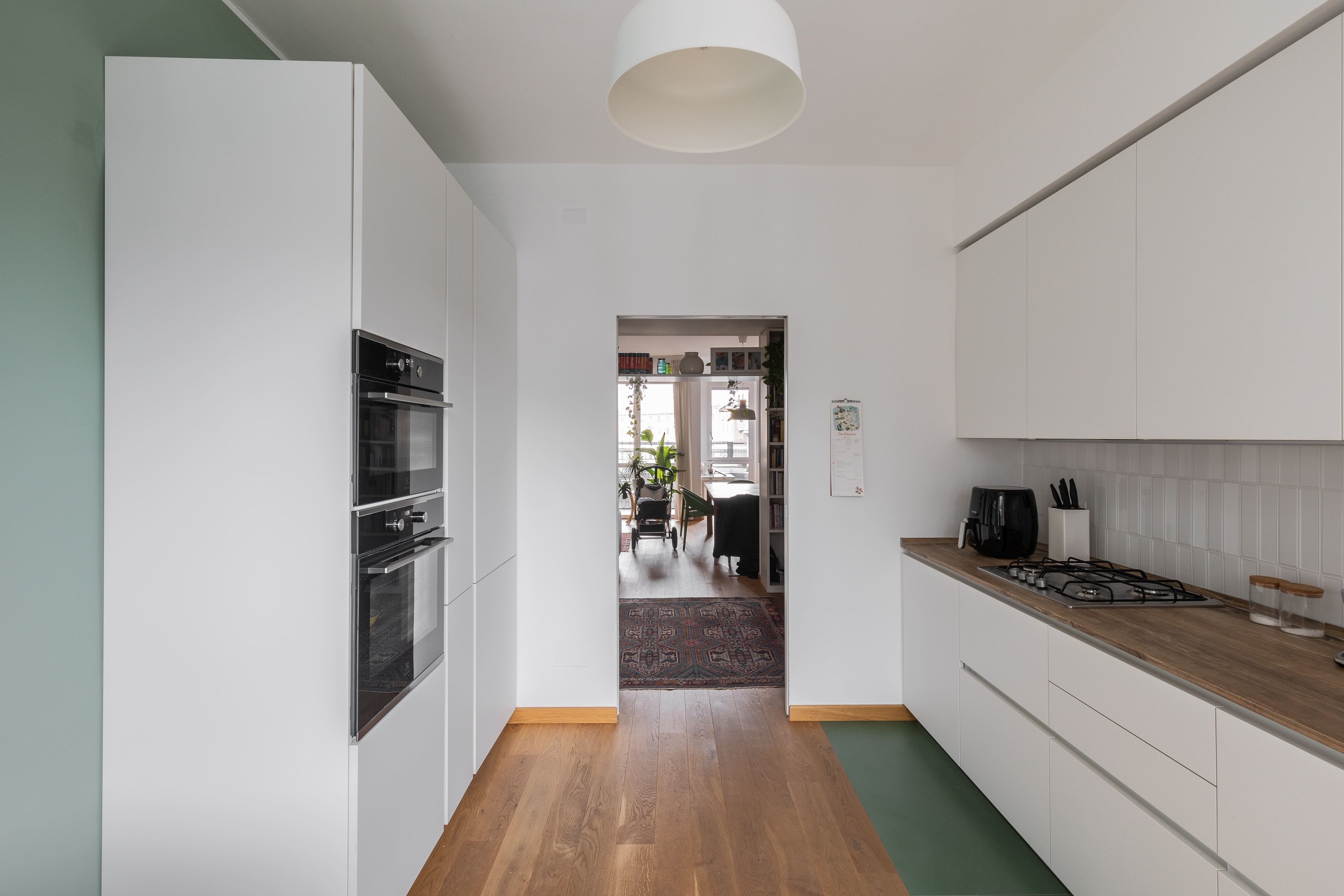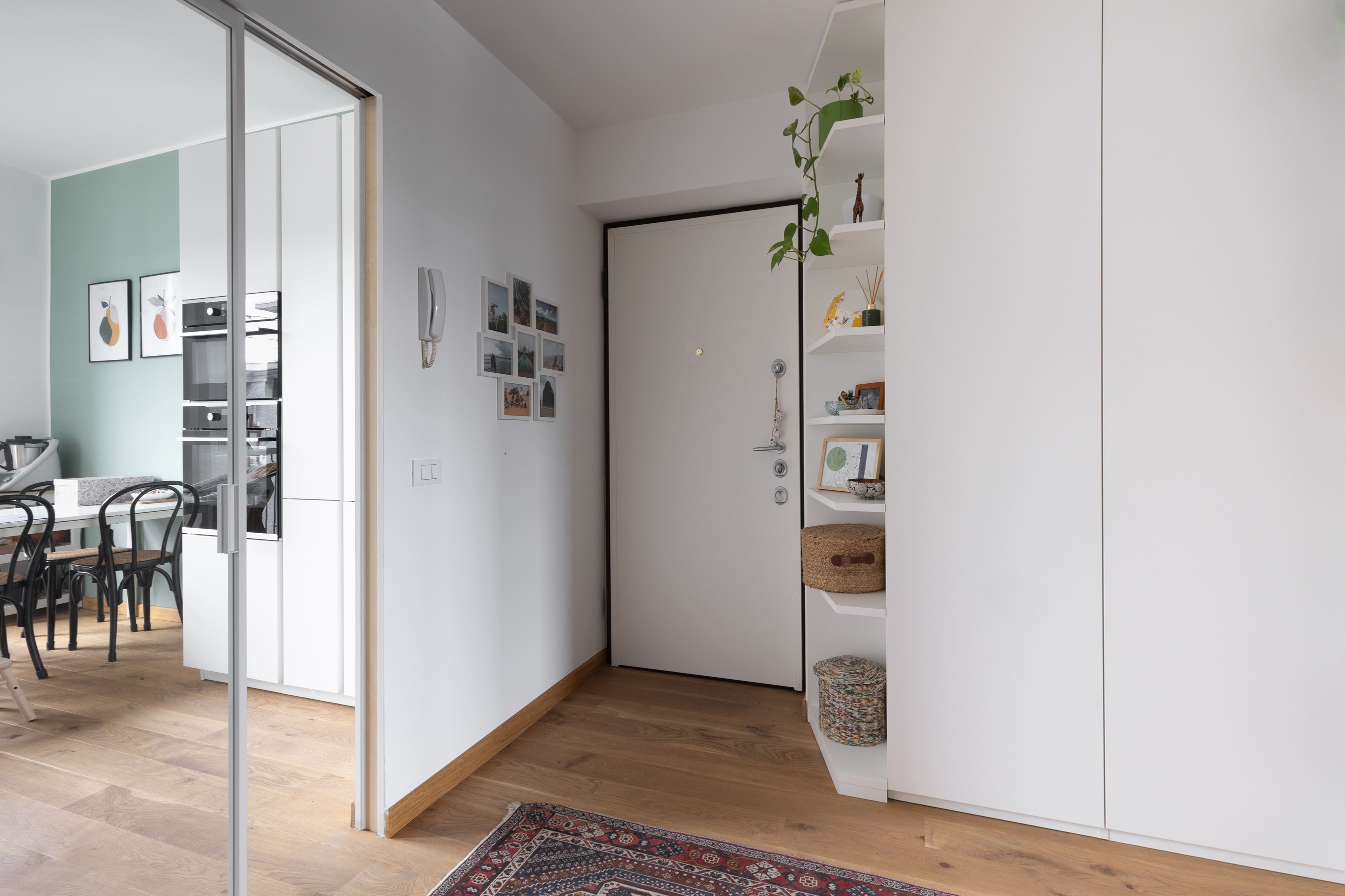 Appartamento anni ’70: migliorata la connessione cucina–soggiorno creando un ingresso ampio, accogliente e funzionale. Zona notte aggiornata nelle finiture e con nuova cabina armadio per la camera padronale.